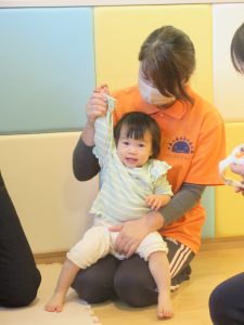 お友だちを次々呼んで、最後はりんご組全員で力を合わせると「やったー!抜けたー!」と大成功