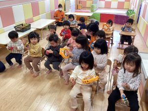 楽器遊びでは、最初音を鳴らして楽しむだけでしたが、楽器に慣れてきた現在では、それぞれの楽器の持ち方や、音の鳴らし方も知って楽しめるようになっています