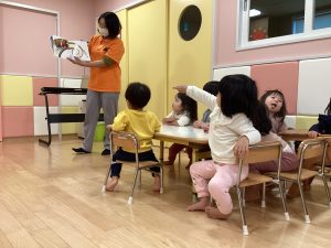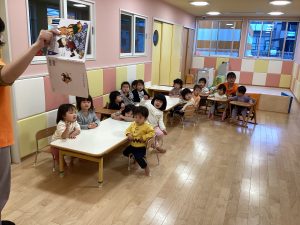 お日様と聞いて園のロゴを指差す子もいれば、お月様の夜がハロウィンに繋がる子も![]()