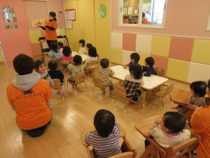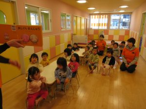 このおまんじゅうたち、最後には「パクッ」と食べられちゃいます。初めて見た際には「えっ…」と驚いたような表情の子どもたちでしたが、今はもう結末を知っているので「きたきた…もうすぐたべられるぞ〜」と、ワクワクした表情で見ています![]()