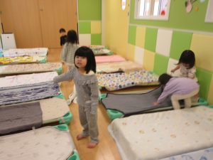 コットと各自の布団は、毎日保育者が準備していますが、給食を早くに終えた時など、空いた時間には2歳児が一緒に手伝っていますよ![]()