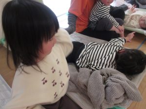 「ねんねよ〜」と、0.1歳児たちの身体を優しくトントンしています。なかにはそのまま本当に眠ってしまう子も![]()