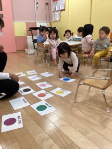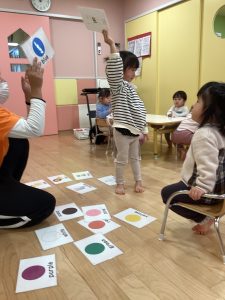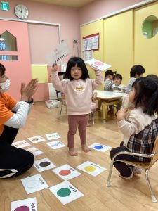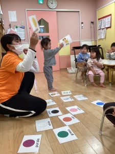 例えば、「yellow dog」と保育者が言うと、それを聞いて色カードから1枚「yellow 」のカードと動物カードから1枚「dog」のカードを取るゲームです✨