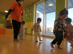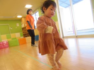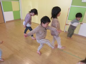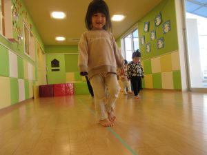 初めはそーっとそーっと渡っていた子どもたちでしたが何度か繰り返していると早歩きでもテープから落ちずに歩くことができるようになってきましたよ♪