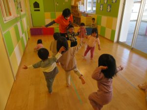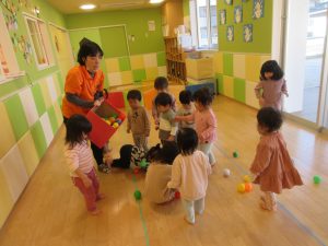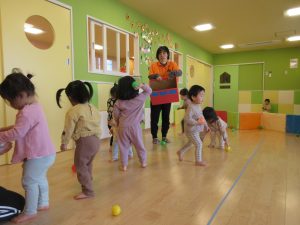 下から投げるのは少し難しい動きですが保育者の真似をしながら一生懸命腕を振って下からバスに向かってポーンと投げているんですよ![]()