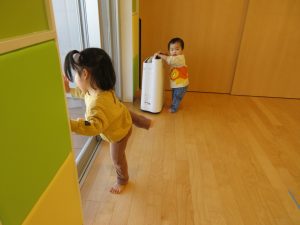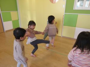 いちご組さんともも組さんは壁や保育者に捕まりながらも自分で足を上げようと頑張っていますよ🍓