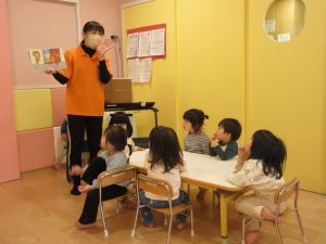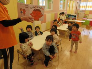 たろうくんが豆をまこうとすると「うえーーん!」大粒の涙😢そして、この辺りで感情移入していく子どもたち。「鬼さん泣いちゃったね。かわいそうだね」心配そうに絵本を見ています。