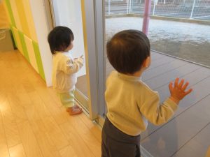 芝がうっすらと白くなり、ドア越しに眺めている子どもたちでしたが、戸外に出る頃には天気がよくなり、すっかり溶けてなくなっている様子をみて