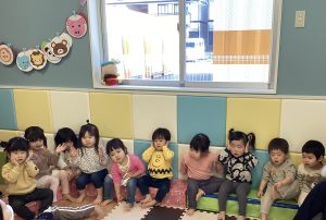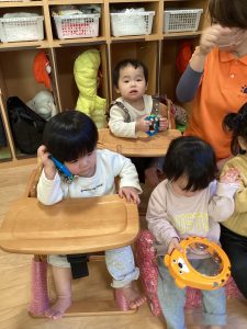 上記のねらいをふまえながら2月は、こぎつねこんこんやおもちゃのマーチの歌を歌ったり、曲に合わせて♩と♪♪のリズム遊びや楽器遊びを楽しんでいます。