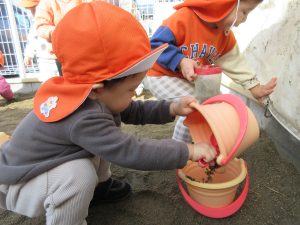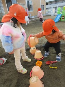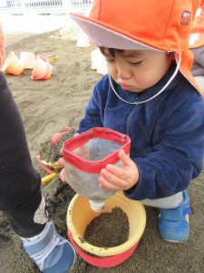 砂場では、お団子作りや容器への移し替え、穴あけや宝探しゲームも![]()