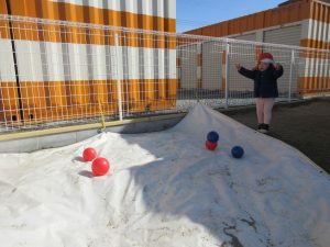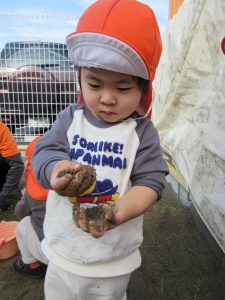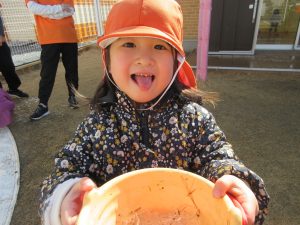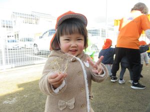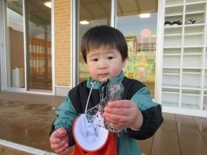 寒い日は砂場シートの上に氷ができるので、お楽しみの1つでもあります。今回も「あったよ!」「氷できてるー!」と目をキラキラさせながら集めていました![]()