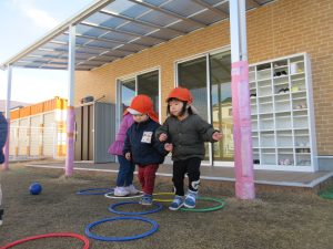 ボールをいっぱい投げ入れたり、フープ跳び、手繋ぎ走りも楽しい〜![]()