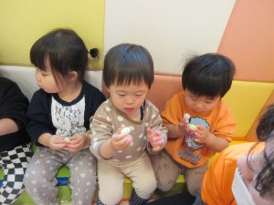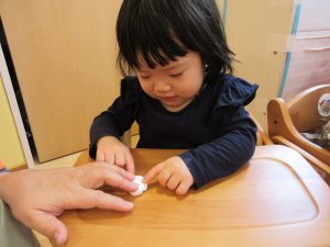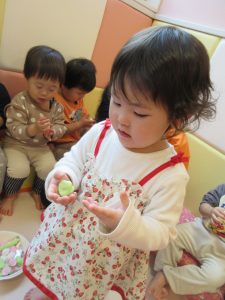 もも組さんは保育者と一緒に丸めとってもかわいいあられができました🍑