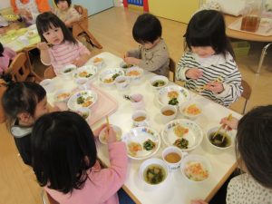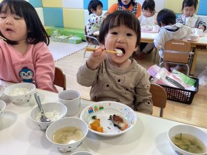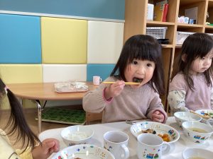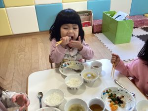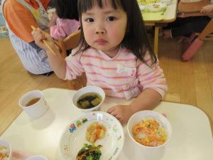そして「すごいね!頑張ってるね!」と褒められているお友達を見て、スプーンを使っていた子ども達も「やっぱりお箸使う」「○○ちゃんもお箸で食べる」と頑張る姿が