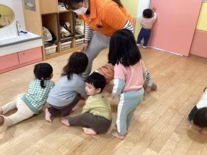 曲の間奏、保育者がトンネルを作るとハイハイをしながらくぐったり、飛行機のポーズでくるくる回ったりと楽しんでいます😃