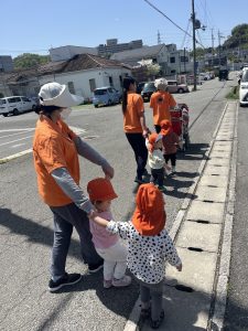 散歩に行く前には、どの先生と手を繋ぐのか、何色のバギーに乗るのかも、一緒に確認。車や自転車が通る時のお約束もしました。