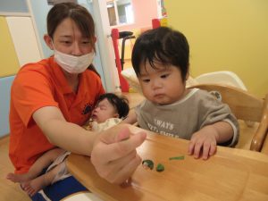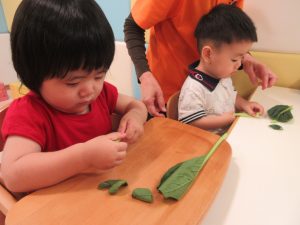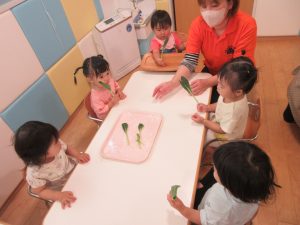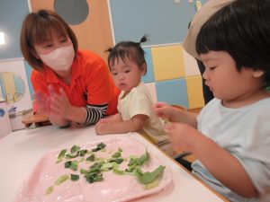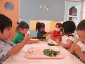 「先生!見て見て!上手にできた!」と保育者に見せてくれる子もいたり、黙々と小松菜をちぎっている子もいました😃
