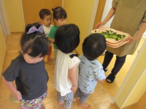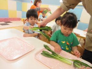 あまり目にする事がない小松菜ですが、『あれなに?!』『緑の葉っぱついてる!』と興味津々の子どもたち😊