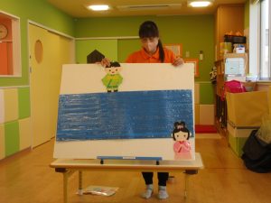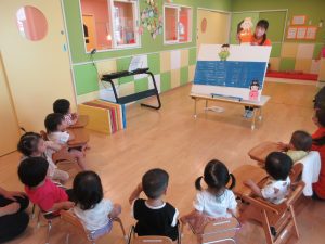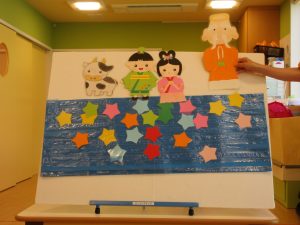 次に七夕のペープサートを見ました。七夕とはどんなことなのか簡単にし、織姫さまや彦星さま、神様などを使ってお話を聞きました。子どもたちは登場人物が出てくるたびに大興奮でした🤭