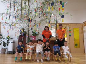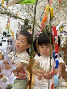 まず七夕とは、織姫様とと彦星様が天の川を渡って、1年に1度だけ出会える7月7日の夜のことです。短冊に願い事を書いて、笹竹に飾り付けます。 サンライズキッズ保育園でも、お家から子どもたちと保護者の方が書いた短冊を持って来てもらい、玄関の笹に飾っています🤭