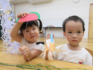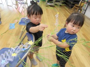 とみた保育園のお兄さんお姉さんと一緒に、笹に飾りをつけました🎵