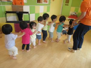 それを見た1歳児さんも仲間入り、一緒に貨物列車になり楽しみましたよ!