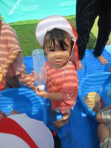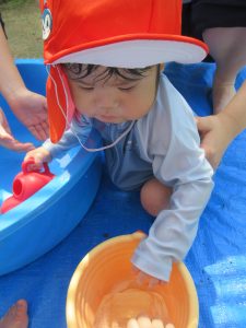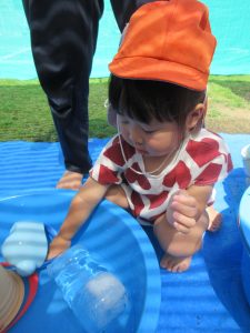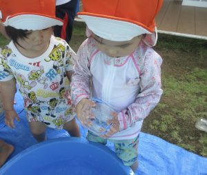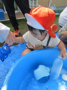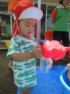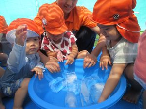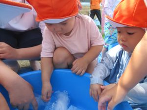 みんな大分水に触れることに慣れてきました!毎日とても暑く、気温も高くなっていたので、外遊びができる日もシャワーのみだったり、足を水につけたりすることしかできずにいました😢水遊びが始まったばかりの頃は、ジョウロやバケツなどの玩具で遊んだり、的当てや、ペットボトルを水鉄砲に見立てて遊んだりもしました😆気温が高いと熱中症になってしまう可能性があるのであまり外に出る事ができず、子ども達が涼しく過ごせるように先生達が家で作った氷を持ち寄り遊んでもらいました🧊