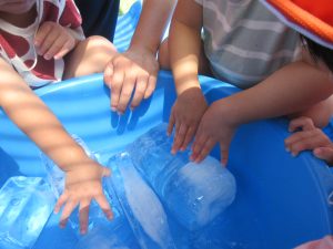 色々な形の氷に子ども達は興味津々❕いざ触ってみると「きゃーーっ♡」「つめたーーい!」「きもちい!」など沢山楽しそうな声が聞こえてきました☺️
