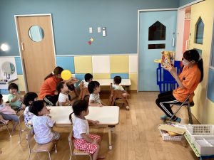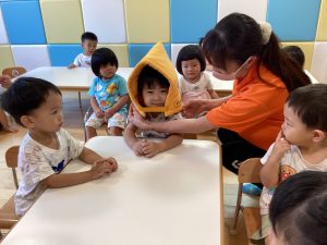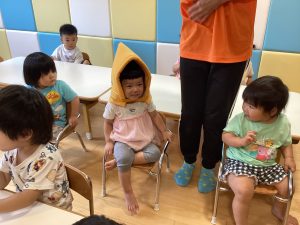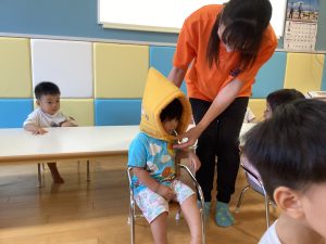 紙芝居の後に、大切な頭を守ってくれる防災頭巾のかぶりかた、ダンゴムシのポーズも練習しました
