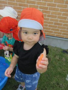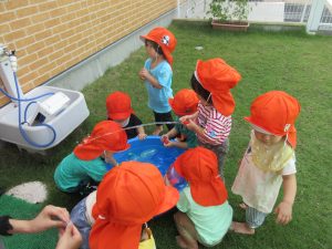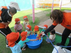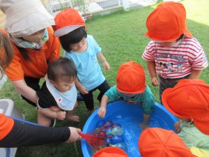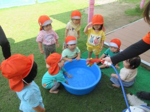 まだ残暑の厳しいこの時期、8月いっぱいで水遊びは終了したものの、暑さしのぎに園庭に水を撒くと「つめた〜い」「気持ちいい〜」と大喜びの子ども達です❣️