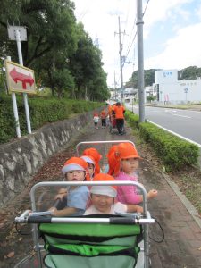 園を「let’s go!」と元気に出発して歩道をガタゴトガタゴト揺られ、大きな自動ドアに自分たちが映り「バイバーイ」と手を振り👋😊