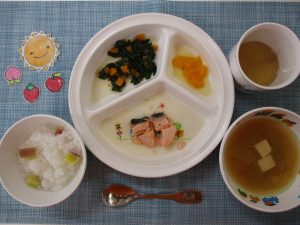 (写真は後期食です。離乳食は、離乳食の段階ごと固さ、切り方、量を変えて提供しています。)