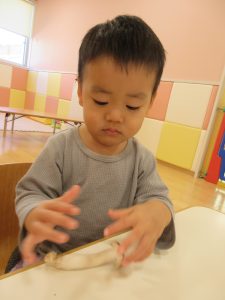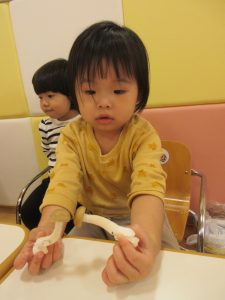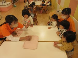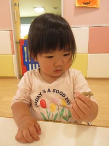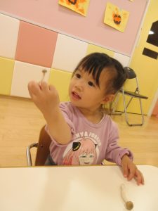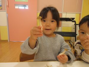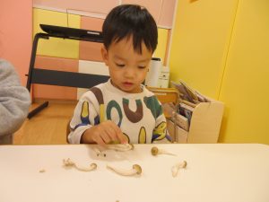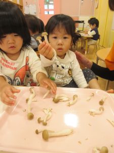 りんご組さんは、「なんか柔らかいね」「きのこのにおいするで〜」と言ったり、机に並べてぶなしめじの家族を作っている子もいました😊