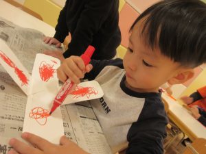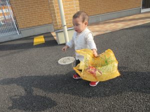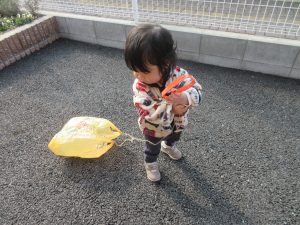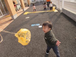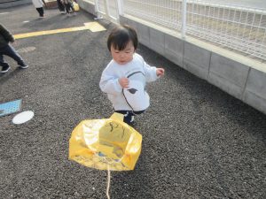 「わあ!」「あ〜っ!」と凧を追いかけているのは0歳児さん。日差しの暖かい玄関前で、いっぱい歩いて楽しんでいましたよ。