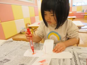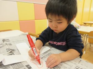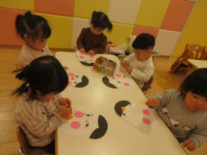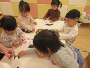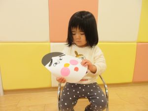 「目はどこかな?」「ここっ!」「じゃあ お鼻は?」「こっち!」という具合に、みんなで一緒に顔のパーツを確認しながら貼り付けていきました。