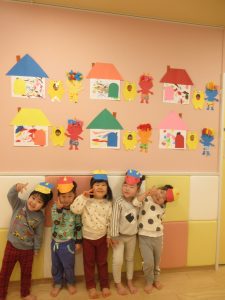 朝登園すると、製作で作った鬼を頭やお腹につけていました👹