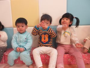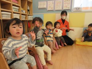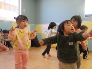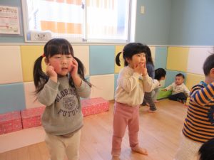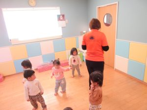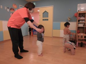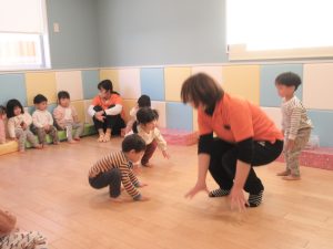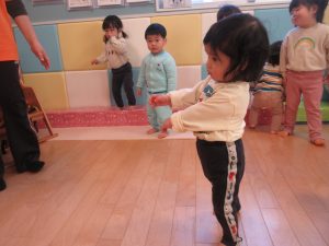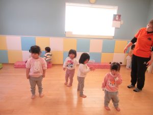 1歳児さんは先生や2歳児さんの真似をしたり、少しずつ動詞の単語が分かってきて先生が単語を言うとその動きが出来るようになってきました♪