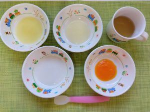 (写真は後期食です。月齢によって形、固さ、盛り付け量を変えて提供しています。)