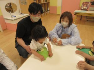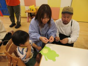 いつも思うことですが、出来上がったカエルはなぜか作った本人によく似ていて「これ〇〇ちゃんのかな?」「これは〇〇君の!」と保育者同士、名前を見ずに製作者を当てっこ❣️