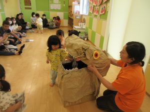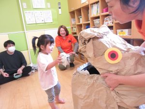 その流れで、バスにのって、こりゃどこのじぞうさん、など子ども達の喜ぶポイントを伝えながら、親子で楽しんでもらいました。