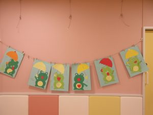子ども達の自由な発想でとても可愛いカエルとカサが出来上がりました。いちご組の壁に飾っていますので、是非ご覧下さいね🥰