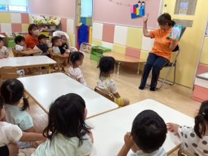 みんな大好きな絵本なので、表紙を見るとすぐに「きらきらぼしー!」とりんご組が言い、その隣ではいちご組が両手を上に挙げてキラキラとさせていました🌟
