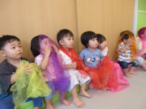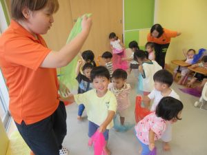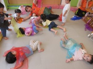 表現あそびでは、リトミックスカーフ🧣を取り入れて動物になりきったり、物に見立てたりしながら楽しんで取り組んでいます🎶