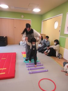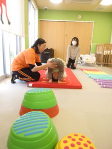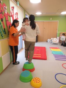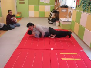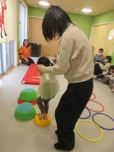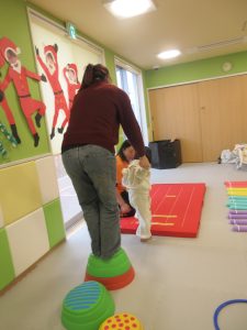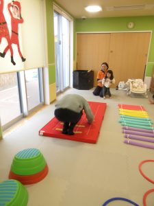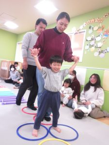 カリキュラム体操ではマットで前転をしたり、プールスティック、バランスストーンやフラフープに親子で挑戦していただきました!!