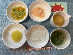 (写真は離乳食後期です。年齢によって形、固さ、盛り付け量を変えて、提供しています。)
