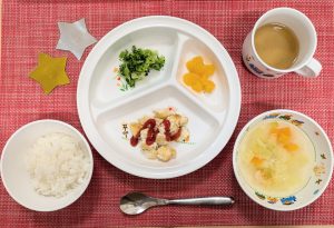 たくさん遊んだあとは、お待ちかねのチキンナゲット♪「やったー!」と嬉しそうでした。野菜たっぷりのポトフもたくさん食べていました。