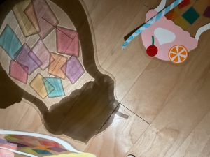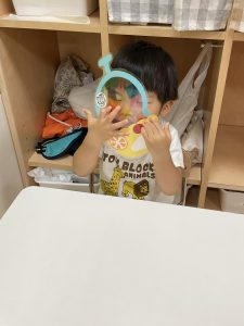 「ばあ〜!」と可愛いお顔を覗かせてくれたり、光に当てて色を映し出すとキャキャと笑いながら色を掴もうとして光遊びを楽しんでいましたよ。