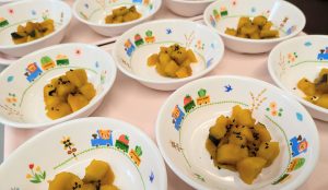 タラと野菜をケチャップソースでからめているので、魚がしっとりとして食べやすい様子でした。子どもたちは、おいしそうにたくさん食べていました♪