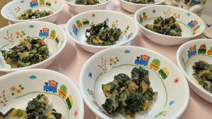 (写真は後期食です。月齢によって形、固さ、盛り付け量を変えて提供しています。)
