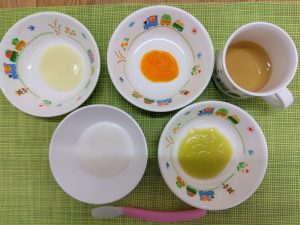 (写真は後期食です。月齢によって形、固さ、盛り付け量を変えて提供しています。)